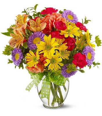 All their wishes will come true when they receive this bright and sunny flower arrangement - a summery mix of yellow daisy chrysanthemums, purple asters, hot pink and orange carnations and more, adorned with a cheerful yellow plaid bow. Send one today, and make someone's day!